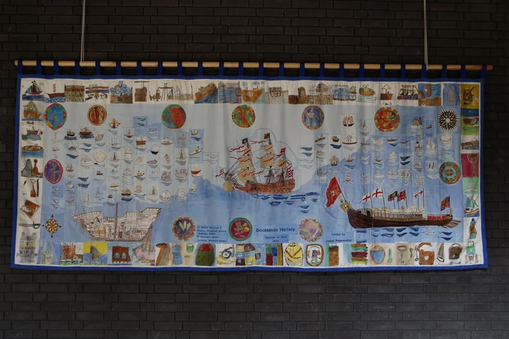 On completion in 2000, 43 artists had contributed and over 3,000 people across Tower Hamlets had participated. Fifty 8 foot by 10 foot tapestries were made, on subjects ranging from The Tower of London to The Loom, Chicksand Estate to River Traffic today.